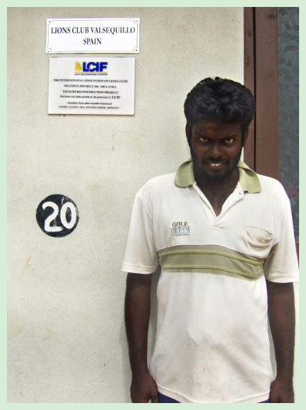 V. G. Udaya Priyankara 2.- Personas que habitan la Casa: 1 Un hombre de 27 años, que vive solo, ya que perdió a su esposa e hijos por causa del Tsunami. 3.- Qué hacían anteriormente y qué hacen en la actualidad: Actualmente vende cocos al borde de la carretera.