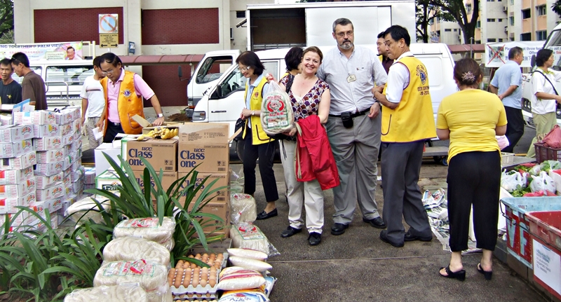 Camino a Sidney, mi mujer y yo fuimos acompañados por el compañero Nicolas Hernández del Club de Leones San Miguel de la Palma, para acortar algo el viaje hicimos una parada de tres días en Singapur. Contacté los Leones de Singapur y visitamos un par de actividades y almorzamos con ellos. Una de estas actividades a las que asistimos fue que un día de la semana ellos consiguen que los supermercados y mercados de abasto entreguen todo la comida que está a punto de caducarse, y ellos la entregan a diferentes ONG’s de la ciudad, realmente es increíble las toneladas de alimentos que había, incluyendo productos frescos como verduras, fruta, carne, pescado, etc. Ocupan un gran aparcamiento donde se entregan los alimentos a los Clubes de Leones, para luego dividirlo y entregarlos a las diferentes ONG’s que vienen con sus camionetas a recogerlo.