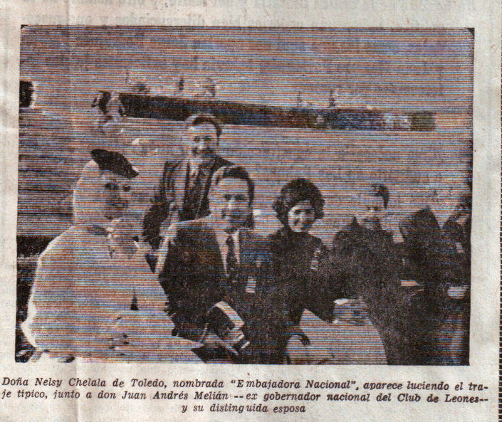 VICEGOBERNADOR NACIONAL Hoy, aún nos ha dicho el doctor Toledo, la petición de celebración de Convención Nacional en nuestra ciudad será presentada en la asamblea del Club de Leones para su ratificación. Hasta el momento don Gregorio Toledo ostentaba el cargo de presidente del Club de Leones de Las Palmas, en el que cesa ahora para ocupar el de vicegobernador nacional a petición del gobernador electo. --En todas las convenciones nacionales -prosigue el doctor Toledo-, cada club lleva su embajadora. En esta ocasión fue mi esposa representando al Club de Las Palmas y sobre ella ha recaído el título de Embajadora Nacional. Doña Nelsy Chelala, luciendo con elegancia el traje típico de la tierra, ha conseguido para nuestra provincia un nuevo galardón, motivo por el cual desde aquí la felicitamos. --En el concurso de la Federación de Club de Leones de España, Las Palmas obtuvo la placa de oro, valiosa distinción que desde ahora tendremos aquí. Pero no todo acaba, puesto que Canarias en general -y nos referimos a su Club de Leones ha sido la gran "Vedette" de esta convención, nacional, con una nueva distinción se trajo para Las Palmas. --Se nos otorgó un premio sin precedentes dentro del leonismo español, concedido a Canarias por considerar que los clubs de esta región han sido los que mejor trabajaron. Consistió en un diploma en el que figuran los clubs de Leones de toda la región que han sido distinguidos. Para el