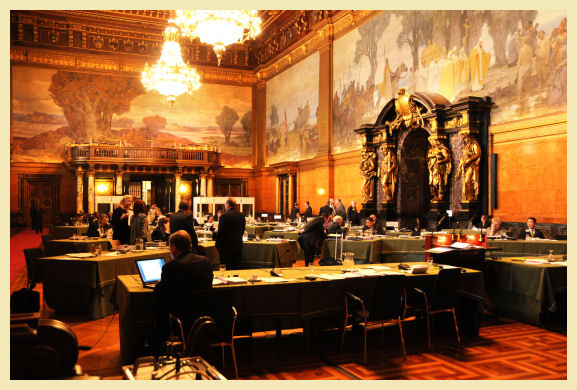Somos también responsables de proponer las condiciones para recibir los premios, repasando las condiciones que deben tener los candidatos para recibir estos premios. Aquí solamente reconfirmamos lo realizado en la anterior Junta directiva internacional, ya que todo estaba decidido. También, se acuerda que en el directorio Internacional los nombres de los Leones Coordinadores de Regiones y Zonas provisionales figuren en las ediciones de nuestra Asociación y en las páginas webs. Por la tarde tuvimos la apertura oficial, en la sala principal del Ayuntamiento de Hamburgo, edificio maravilloso milagrosamente no destruido durante la segunda Guerra mundial. La apertura empieza por la bienvenida de un ministro del gobierno regional de Hamburgo y seguido por las palabras de bienvenida del Presidente Internacional. Después se aprueba la acta enviada de la Junta Directiva Internacional anterior, celebrada en Nueva Orleans y el acta de la Reunión Ejecutivo celebrada en Enero. Y luego presentar los informes de los representantes del Forum de OSEAL, ISSAME y FOLAC.