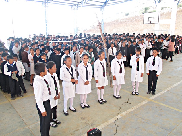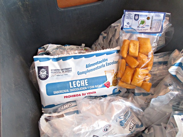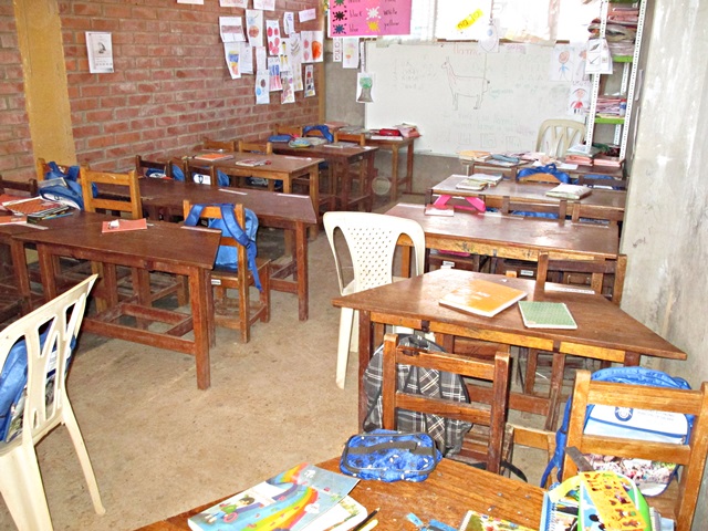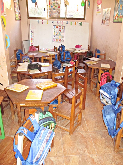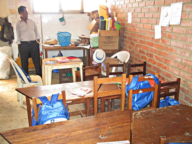 Llegué tarde y fui directamente a la cama, a la mañana siguiente me vinieron a buscar temprano, para llevarme a la población de Sacaba, al sur de Cochabamba. Fuimos a un suburbio de recién creación, hace unos 6 años empezaron a desplazar la población aquí, entre otras razones, los terrenos son más baratos, aquí visitamos la “Unidad Educativa Nuevo Amanecer”. La edificación original del colegio, fue construida por los lugareños, pero luego el gobierno en diferentes fases han construido dos bloques de aulas que están bastante bien, y esperan construir una tercera, ya que la población está creciendo rápidamente. Actualmente hay 777 niños en este colegio, para una población de unas 200 familias, por cierto aquí no hay control de natalidad. Aunque las edificaciones son modernas y buenas, están prácticamente vacías, los profesores no tienen mesas, no hay estanterías y no tienen ordenadores, de hecho me han pedido 20. Incluso los alumnos no tenían mesas, tenían que estar sentados en sillas de plástico, solamente hace unos pocos meses han recibido mesas y sillas nuevas, después de varios años solicitando este material. Después de inspeccionar la escuela, todos los alumnos se pusieron en formación en el patio del colegio y cantaron el himno de Bolivia y diferentes alumnos dieron mensajes de bienvenida. Seguidamente nos dieron una especie de caldo de arroz, papas y carne de bienvenida.