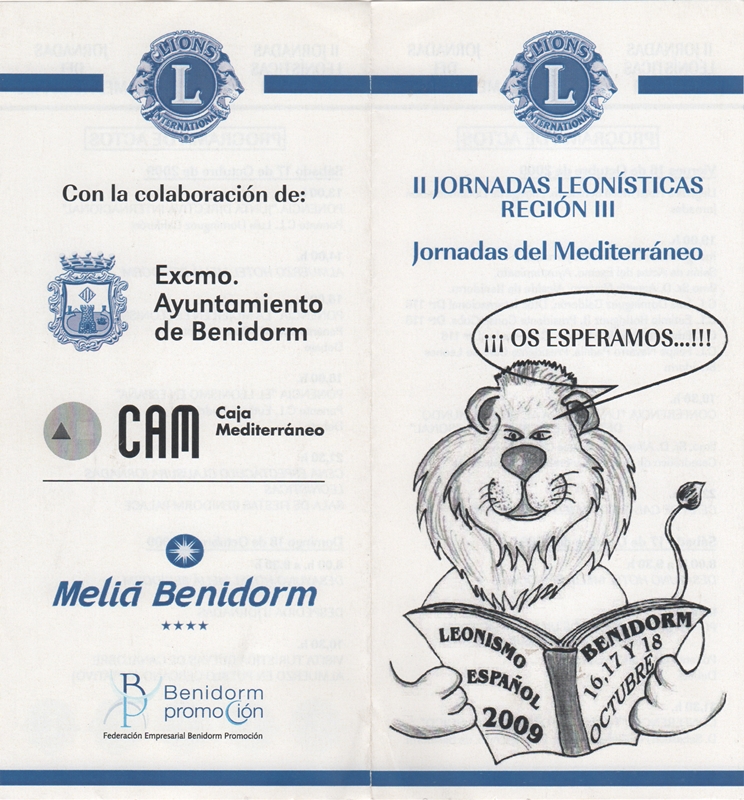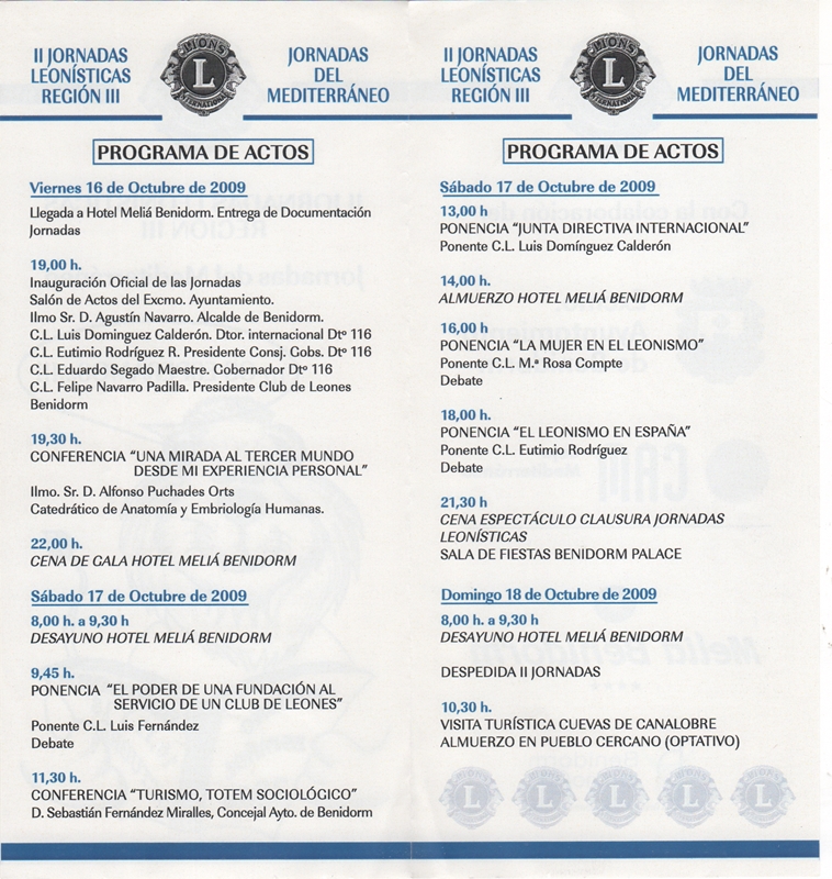 II JORNADAS LEONÍSTICAS DE LA III REGION - DEL DISTRITO 116-A - 2009 Se celebraron en Benidorm, entre los días 16 y 18 de octubre, según el programa previsto. Las Jornadas empezaron en el Salón de actos del Ayuntamiento, el acto fue presidido por D. Agustín Navarro Alcalde de Benidorm, que alabó de una manera muy especial la labor realizada por los Clubes de Leones. Seguidamente en la misma sala, se dio la primera Conferencia a cargo de Ilmo. Sr. Alfonso Puchades Orts, catedrático de Anatomía y Embriología Humanas. Su charla fue sobre su extraordinaria labor que hace a través de las Hermanas de la Caridad en África y Ecuador. Hace más de 15 años, él comprobó la labor que están haciendo estas monjas, él ha querido dedicar su tiempo y esfuerzo para ayudarlas en su labor humanitaria. Como dato curioso, hay que decir que es hijo del que fue el primer Presidente del Club de Benidorm, de hecho, le sorprendieron al final de su conferencia con un cuadro, de una foto de su padre cuando fue presidente del Club.