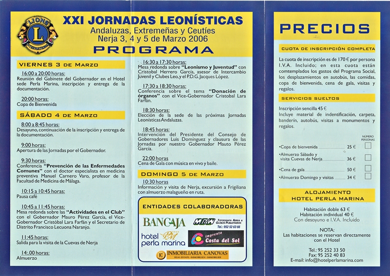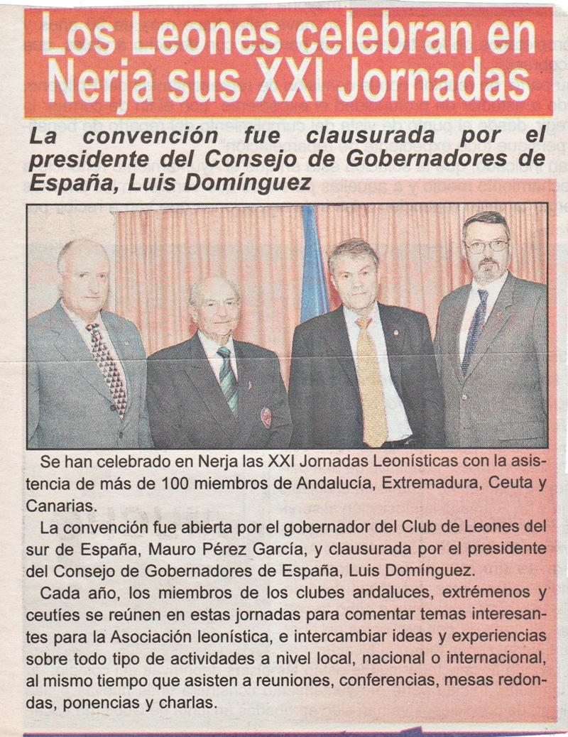Nuestro Gobernador Mauro Pérez entregado un reconocimiento al PDG Demetrio Fernández Insistí bastante en la colaboración de todos para que la Campaña sea un éxito, tanto en la recaudación, como en la publicidad que puede producir para nuestra Asociación. Seguidamente las Jornadas fueron clausurados por el Gobernador y por último la cena de gala con baile en el hotel. El día después, por la mañana, nos dio una charla el Cronista oficial de Nerja, Don Pascual, para luego darnos un paseo por el pueblo, para seguidamente ir a Frigiliana para ver este precioso pueblo andaluz, donde almorzamos comida típica de la zona. Otra vez más felicitar al Club de Nerja y a todos sus socios por la hospitalidad y por saber hacer bien las cosas. ¡VIVA LOS LEONES DE NERJA! Fecha del Correo 9/03/2006