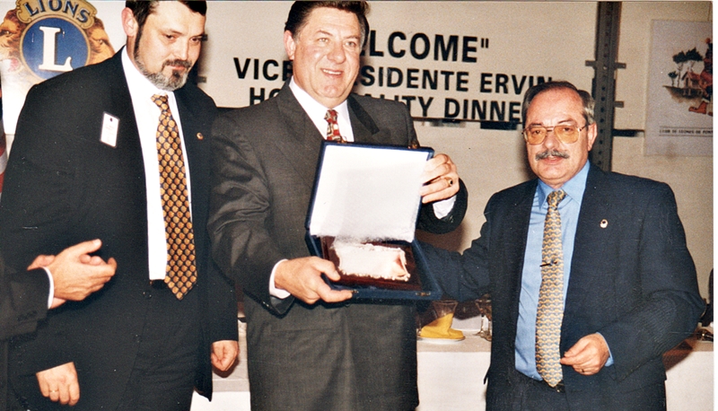 Presentaron al Vice presidente un plato fenomenal delante de el, con la cabeza completa de un cerdo. Pensé para mi, que va hacer el pobre Jim con eso, por lo menos yo no sabría como meterle mano. Pero cual fue mi sorpresa, y creo que la de todos los presentes, que no dudó un instante y empezó a cortar y separar los mejores trozos como si fuera el más expertos de los gurmés gallegos. Luego explicó que el es de campo, y siendo niño se levantaba todos los días a las 5 de la mañana para ordeñar las vacas, para después repartir periódicos en su barrio, y luego ir al colegio. Esto lo hacía para tener la tarde libre para hacer deporte, se ve que desde joven ha sido un hombre tremendamente dinámico. Actualmente tiene una vitalidad increíble y un muy buen apetito. Los que me conocen, saben que tengo buen saque, pero mi amigo Jim me hace la competencia. Le gustó muchísimo toda la comida, muy copiosa como siempre en Galicia, le encantó los vinos, se trago una copa de orujo de un trago al puro estilo western, y se tomó la queimada participando en su preparación con las palabras de embrujo poético, místico y cautivador del amigo Pousada. Hasta se fumó un puro del amigo Manolo Castro. Vamos que no se fue con hambre, espero!!! El día siguiente partió de España para seguir visitando otros países, ente los siguientes destinos estaba Francia e Italia. Quiero destacar la labor extraordinaria hecha por los Leones de Galicia que ha demostrado una vez más su hospitalidad y amistad. Siempre es un placer ir a Galicia, pero estos compañeros hacen que este deseo sea aun mayor. Creo que merece mención especial de agradecimiento al Presidente del Club de Leones Pontevedra y actual Jefe de Región Pepe Acuña, que se ha desvivido en todo momento para que la estancia en España de Jim resultara lo mejor posible. PDG Luis Domínguez Calderón
