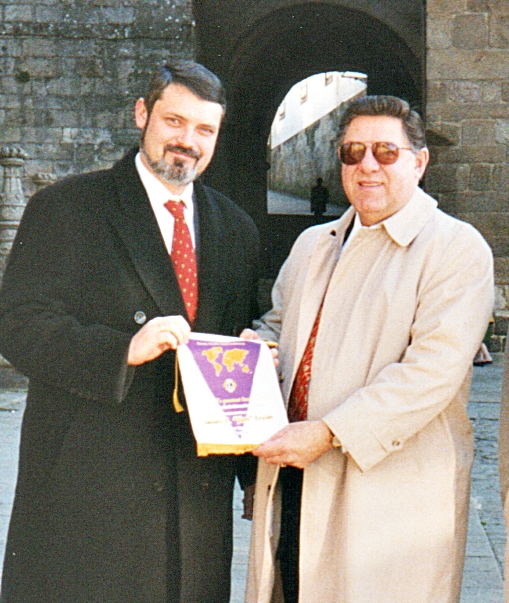 Tuve el honor de ser su traductor oficial, cosa que quiero agradecer al actual Consejo de Gobernadores. Realmente es una gran satisfacción para mi realizar esta labor, ya que tiene uno la posibilidad de estar más cerca de una personalidad como el, para así conocer mejor a nuestra querida asociación. Salí de Andalucía en coche con el Gobernador de mi Distrito, Paco López y llegamos a Oporto para así encontrarnos con el Vice Presidente y nuestro compañero Director Internacional David Fuertes, para así acompañerles la mañana siguiente hasta España. Fuimos invitados por los compañeros Portugueses, que quiero agradecer desde estas páginas su gentileza y amistad. Por la noche asistimos a una cena en homenaje a Jim. La mañana siguiente salió la comitiva hacia España, llegando al Puente de Tuy donde nos esperaban el Presidente del Consejo Jesús Soriano y el Gobernador del Distrito 116-A Guillermo López, además de otros Leones. Seguidamente fuimos a La Guardia para visitar unas ruinas Celtíberas y contemplar unas vistas preciosas de la desembocadura del Río Miño. Después visitamos una bodega de Alvariño, para luego trasladarnos a Vigo, donde se visitó el monumento al Leonismo Español realizado por el Pasado Gobernador Manolo Castro. Luego almorzamos en un restaurante conocido del lugar. Por la noche tuvo lugar una reunión con los Leones de la Región y miembros del Gabinete del Distrito 116-A, donde pudieron hacer a nuestro invitado toda clase de preguntas. Estas preguntas fueron dirigidas especialmente hacia la labor de nuestra fundación y su intervención en Centro América. Esta reunión se prolongó durante algo mas de una hora para después deleitarnos con una cena estupenda con espectáculo incluido. Al final no podía faltar la queimada que fue realizada magistralmente por el Queimador Mayor del Reino de Galicia, el Compañero León Pousadas, del Club de Pontevedra.