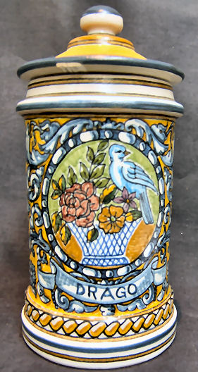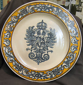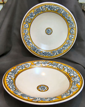 Teresa is the name of the wife of this artist; now don't ask me why, he calls himself Teresa. One day I will ask him. :-)))) They are from the village of Puente del Arzobispo in Toledo, which is in the centre of Spain This chap also works all by himself, and does very very few pieces of ceramic, by looking at them you will understand why, the detail in them is really incredible, in a matter of fact, in some of the pieces I have made a close up picture so you can really see what I mean. I have clients that come every year hoping to find some pieces from him. Unfortunately, as you can see I have very few pieces from him. He made the serves for our princes Elena (the oldest), when she got married, in a matter fact some of the pieces you see here are the same that were made for her, but with her coat of Arms. Obviously I can't sell those pieces, but you can have a set made for you with your coat of arms or what you want in the middle. BUUUUT be prepared to pay a lot of money, he is quiet expensive. The reason is that to make a special serves for you, it would take him a few months of work. You are looking at the renascence style, these is one difference with other craftsmen, and that is that he uses mat enamel, while everybody else uses the shiny one. This gives his work a really unique aspect, very elegant but at the same time, very sober.