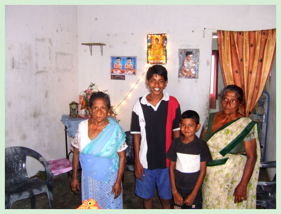 Casa construida por el Leonismo Español en Sri Lanka en colaboración con LCIF, para los damnificados del Tsunami del año 2004 CLUB DE LEONES CIUDAD DE CEUTA 1.- Nombre del cabeza de familia: Se me olvidó coger su nombre 2.- Personas que habitan la Casa: 4 Un mujer que tiene 50 años. Tienen dos niños, niños uno de 15 y 7 años. Además de la abuela, de 75 años. 3.- Qué hacían anteriormente y qué hacen en la actualidad: El marido murió de un ataque de corazón. 4.- Otros temas de interés: Sin comentario. Segunda visita realizada entre el 9 y 11 de Diciembre del año 2009 La otra vez no estaban, por lo tanto no llegue hacer un informe. Pidió una máquina de coser. Se le entregó una máquina de coser, dos latas de pintura. ID Luis Domínguez Calderón