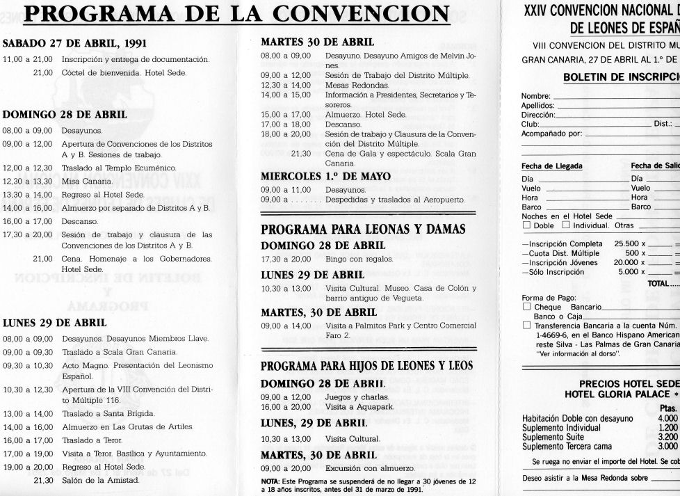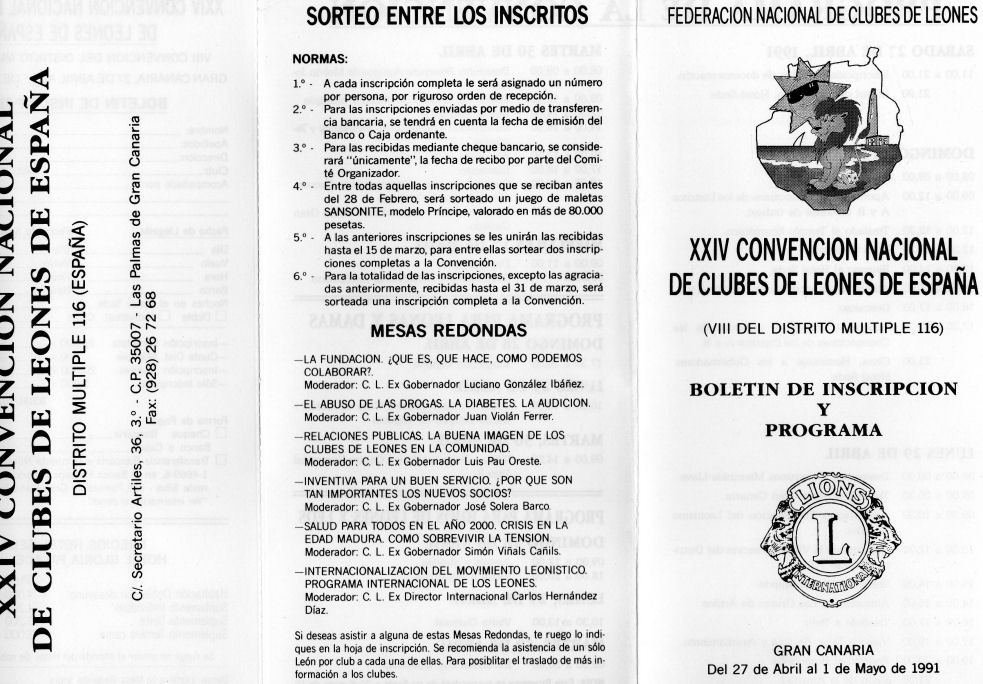 NACIONAL 1991 Memorable Convención Nacional ¡Formidable Estupenda! Maravillosa!.... estas y otras muchas palabras de elogio se escuchaban en los salones del Hotel Sede a medida que se desarrollaba la Convención Nacional. El hecho de que todos los convencionistas estuviésemos en un mismo hotel, ya hada posible una grata convivencia, aparte su organización cuidada al máximo, sin que ello quiera decir que no se haya tenido algún que otro fallo sin importancia. Tal vez el más destacable lo fuese el del extravió de unos estandartes momentos antes del desfile de los mismos. La comprensión de las damas portadoras hizo que esto apenas se notase. Desfilaron ellas sin estandarte pero por contra lucieron su belleza que fue aplaudido y piropeada por los asistentes. Los actos se iniciaron con las convenciones de ambos distritos el día 28, finalizando el mismo con la cena homenaje a los Gobernadores que fue un bonito broche para este día. En los almuerzos de los Distritos los Gobernadores entregaron las distinciones, los premios 100 por 100 a Secretarios y Tesoreros y resultaron gratos encuentros de los componentes de los clubes que lo forman. La Misa Canaria en el Templo Ecuménico resultó de una gran belleza en la que se luci6 sobremanera el coro que actuó en la misma. El Acto Magno de presentación del Leonismo Español en la mañana del día 29 en el Scala, sin duda se recordará como un espectáculo Leonístico agradable, a lo que se prestaba naturalmente las instalaciones de la misma. El almuerzo de ese día en las Grutas de Artiles y la visita a Teror, incluyendo la realizada a la Virgen del Pino, Patrona de Gran Canaria, fueron actos agradable, finalizando la jornada con el Salón de la Amistad en el que se sortearon los premios fijados, entre los primeros inscritos un juego de maletas que correspondió a Juanita Artiles, dos inscripciones gratis que consiguió Angel Nuñez y una inscripción para Enrique Garcia Melón. El Salón de la Amistad como siempre fue muy atractivo, otorgándose el primer premio al stand presentado por los Clubes de Cataluña. Dos coros de jóvenes interpretaron durante las horas que duró esta agradable convivencia, música y bailes típicos de Canarias con actuación también de orquesta que animó a los asistentes a bailar. Finalizó el salón con una vista de fuegos artificiales, que fue muy aplaudida. El día 30 se inició con el desayuno de AMIGOS DE MELVIN JONES, en el transcurso del cual los asistentes se comprometieron a llevar el mensaje de nuestra Fundación por todos los clubes, realizando una buena campaña de información. En las sesiones de trabajo de la Asamblea del Distrito Múltiple, se estudiaron los Estatutos y Reglamentos con las modificaciones propuestas por varios clubes, unas aceptadas y otras no. Se incluyen en ellos la nueva fórmula de elección del Presidente del Consejo de Gobernadores, que a partir de ahora se hará por la Asamblea de Delegados, con presentación de candidatos 90 días antes de la Convención. El texto de los Estatutos y Reglamentos actualizados, se incluirán a partir de ahora en los Directorios anuales, a fin de que cada compañero Leon pueda tenerlos personalmente. En este día se celebraron las charlas de información a Presidentes, Secretarios y Tesoreros y se celebraron las anunciadas Mesas Redondas que constituyeron un rotundo éxito de participación e intervención de cuantos estuvieron presentes en las mismas. Las conclusiones adoptadas las publicaremos en el próximo número de LEONISMO ESPAÑOL. Finalmente, la Cena de Gala de clausura, con espectáculo de la Scala, puso el broche de oro a los días de convivencia que tan gratamente hemos vivido en Gran Canaria. Nuestra cordial felicitación a organizadores y participantes Esta ha sido una memorable Convención.