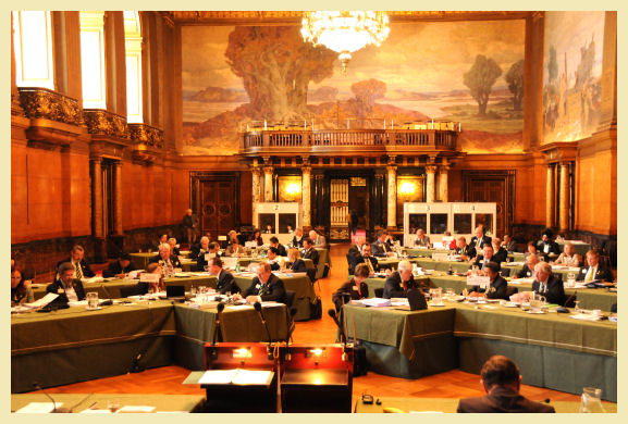 Somos también responsables de proponer las condiciones para recibir los premios, repasando las condiciones que deben tener los candidatos para recibir estos premios. Aquí solamente reconfirmamos lo realizado en la anterior Junta directiva internacional, ya que todo estaba decidido. También, se acuerda que en el directorio Internacional los nombres de los Leones Coordinadores de Regiones y Zonas provisionales figuren en las ediciones de nuestra Asociación y en las páginas webs. Por la tarde tuvimos la apertura oficial, en la sala principal del Ayuntamiento de Hamburgo, edificio maravilloso milagrosamente no destruido durante la segunda Guerra mundial. La apertura empieza por la bienvenida de un ministro del gobierno regional de Hamburgo y seguido por las palabras de bienvenida del Presidente Internacional. Después se aprueba la acta enviada de la Junta Directiva Internacional anterior, celebrada en Nueva Orleans y el acta de la Reunión Ejecutivo celebrada en Enero. Y luego presentar los informes de los representantes del Forum de OSEAL, ISSAME y FOLAC.