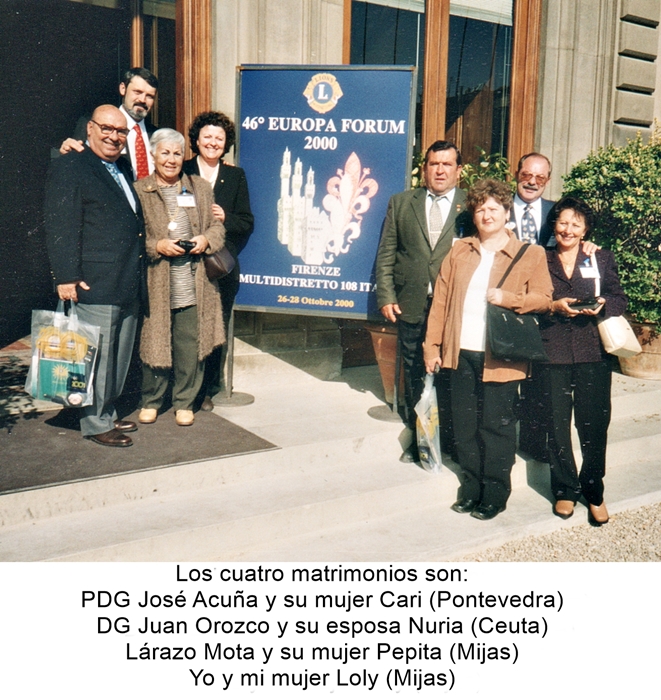 Y finalmente, gracias a Dios, la reunión de Observatorio del Convención del Mediterráneo, de la cual soy miembro designado por España. Donde se trató los eventos que se desarrollarán en esa convención que se va a celebrar en Taormina (Sicilia ) en Marzo próximo. Por la noche cenamos en el Palacio Corsini, lugar precioso una maravilla, para llegar nos hicieron pasar por la famoso galeria de los retratos de la Galeria de los Uffizi, que atraviesa el famoso puerte cubierta de Florencia. ¡ESPETACULAR! Al día siguiente, el PEC de Relaciones Internacionales, donde el tema principal fue “Una nueva era; visión, a través y pasando las fronteras”, fue un charla más bien filosófica sobre la necesidad de que una asociación como la nuestra, tiene que ser solidaria y no tener las fronteras formando barreras para nuestras acciones sociales. Pero lo más importante fue, a mi modo de ver, que el tema presentado por España, fue seleccionado como tema principal para el próximo Forum Europeo en Oporto (Portugal). Según me consta, la última vez que España presentó un tema principal fue precisamente hace 22 años en el Forum de Torremolinos en el año 1.978, la verdad es que ya era hora. Luego reunión general con el Presidente internacional, donde los participantes tuvieron la posibilidad de hacer preguntas o hacer sugerencias al presidente. El también habló sobre su programa internacional, repitiendo un poco lo que dijo en su reunión con los gobernadores de distrito, hace dos días. Por la tarde la segunda reunión del Consejo de Europa, donde los diferentes presidentes de los PEC’s dieron cuenta de la labor realizada en sus reuniones, al igual que los presidentes de los diferentes seminarios dieron un pequeño informe de lo que se ha tratado. En seguida se inició la ceremonia de clausura con dos oradores especiales, primero un representantes de ESPECIAL OLYMPICS, y después se dio una charla sobre la mortalidad infantil con sus razones y consecuencias, la verdad es que fue espeluznante. Luego se dio el resultado del premio de la música, siendo la ganadora la Italiana y la segunda fue de Austria, nuestra participante quedó en muy buen lugar a pesar de su juventud. Siguió con la presentación de los tres próximos directores internacionales Europeos, siendo uno de Italia, otro de Dinamarca y el otro de Finlandia. Terminó el acto con un informe final del Forum, la presentación del Próximo Forum de Portugal en Oporto y las palabras del representante oficial del Presidente Internacional en el Forum el Director Internacional Phil Nathan. El broche de oro fue la cena celebrada el la Fortaleza Basso, que fue animado por juglares, artesanos, músicos, cantantes, bailarines, etc… de la época medieval, todo un espectáculo de belleza, color y armonía, acompañado por una copiosa y generosa cena, donde hubo una selección increíble de la cocina típica Toscana, rociada con delicioso vino Italiano, que más se podía pedir. PDG Luis Domínguez
