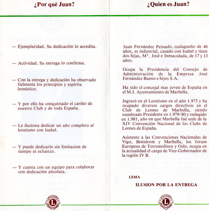 XVI Convención Nacional. Presidida por el Gobernador Juan Fernández, se celebró en La Toja, organizada por el Club de Leones de Pontevedra, del 11 al 14 de Mayo de 1983. Se acordó autorizar la continuidad de la presencia en los Clubes de Leones de las viudas de compañeros Leones. El Comité de Mociones propuso y fue aprobada, la actualización de mociones aprobadas en Convenciones y en vigor hasta la fecha para la eliminación de las obsoletas. En este año se alcanza el número de Clubes y de socios necesario para la multiplicación del Distrito, lo que, previa solicitud y autorización de la Junta Directiva Internacional permitía la creación del Distrito Múltiple 116 por lo cual se eligen los Gobernadores de los Distritos 116 A y 116 B, respectivamente, José López, del Club de Leones de Benidorm y Juan Topham Wildpret del Club de Leones de Puerto de la Cruz, quedando como Presidente del Consejo de Gobernadores, según lo establecida en la Convención extraordinaria de Madrid, el Pasado Gobernador inmediato Juan Fernández Peinado.
