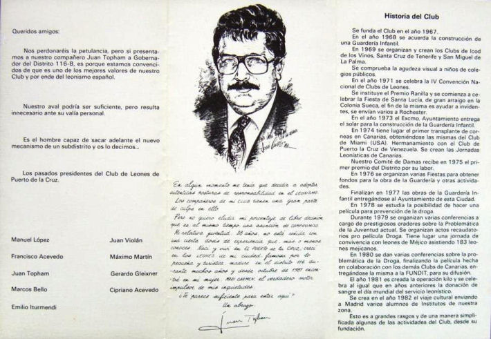 XVII Convención Nacional. Presidida por Juan Fernández Peinado como Presidente del Consejo de Gobernadores, se celebró en Zaragoza a continuación de las Primeras Convenciones de Distrito de los Distritos 116 A y B, del 10 al 12 de Mayo de 1984. La triste pérdida que conmovió al Leonismo Español del Gobernador Electo del Distrito 116 A, José López Fernández, antes de entrar en funciones, hizo que fuera nombrado Gobernador del D 116 A, a propuesta de las autoridades Leonísticas Españolas y mediante ratificación de Lions Clubs International, Pablo Villabona Carapeto. De manera que las Primeras Convenciones de Subdistritos fueron presididas por Pablo Villabona, Gobernador del D 116 A, y Juan Topham Wilpret, Gobernador del D 116 B. En el Distrito 116 A se aprobó la creación de un Premio Leonístico a la eficacia administrativa : "Reconocimiento Leonística José López". En el Distrito Múltiple se aprueban las modificaciones a los Estatutos sobre el respaldo de la Candidatura a Director Internacional que sólo será válido para dos Convenciones Internacionales sucesivas. Asimismo se aprueba la creación de un fichero en el Distrito Múltiple para que sea efectiva la no readmisión en ningún Club del Distrito Múltiple de un socio expulsado justificadamente de su Club. Hubo dos candidatos a Director Internacional, Carlos Hernández, del Club de Leones Las Palmas y Alberto Gordillo del Club de Leones Alicante 22.000, saliendo elegido para el periodo 1985/87 el compañero Carlos Hernández. En las primeras Convenciones de Subdistritos fueron elegidos gobernadores de los Distritos 116 A y B respectivamente, para 1984/85, Felipe Navarro Padilla del Club de Leones de Benidorm y Manuel Márquez Campos del Club de Leones de Torremolinos.