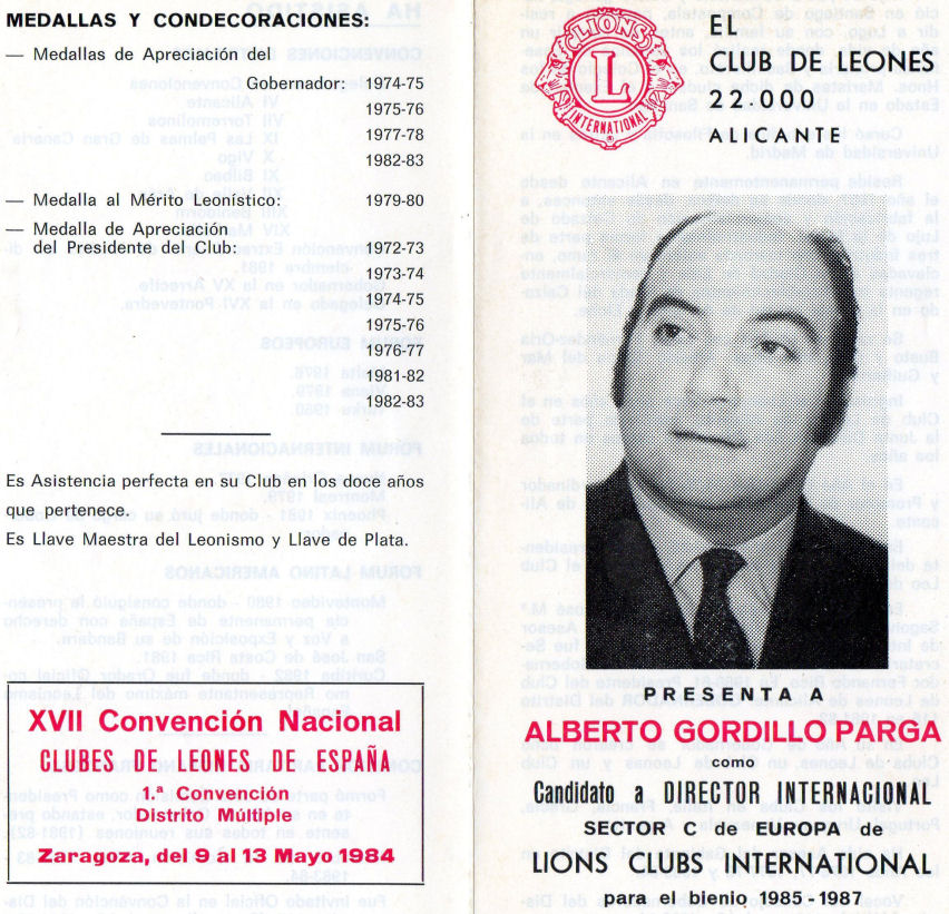 Hubo dos candidatos a Director Internacional, Carlos Hernández, del Club de Leones Las Palmas y Alberto Gordillo del Club de Leones Alicante 22.000, saliendo elegido para el periodo 1985/87 el compañero Carlos Hernández.