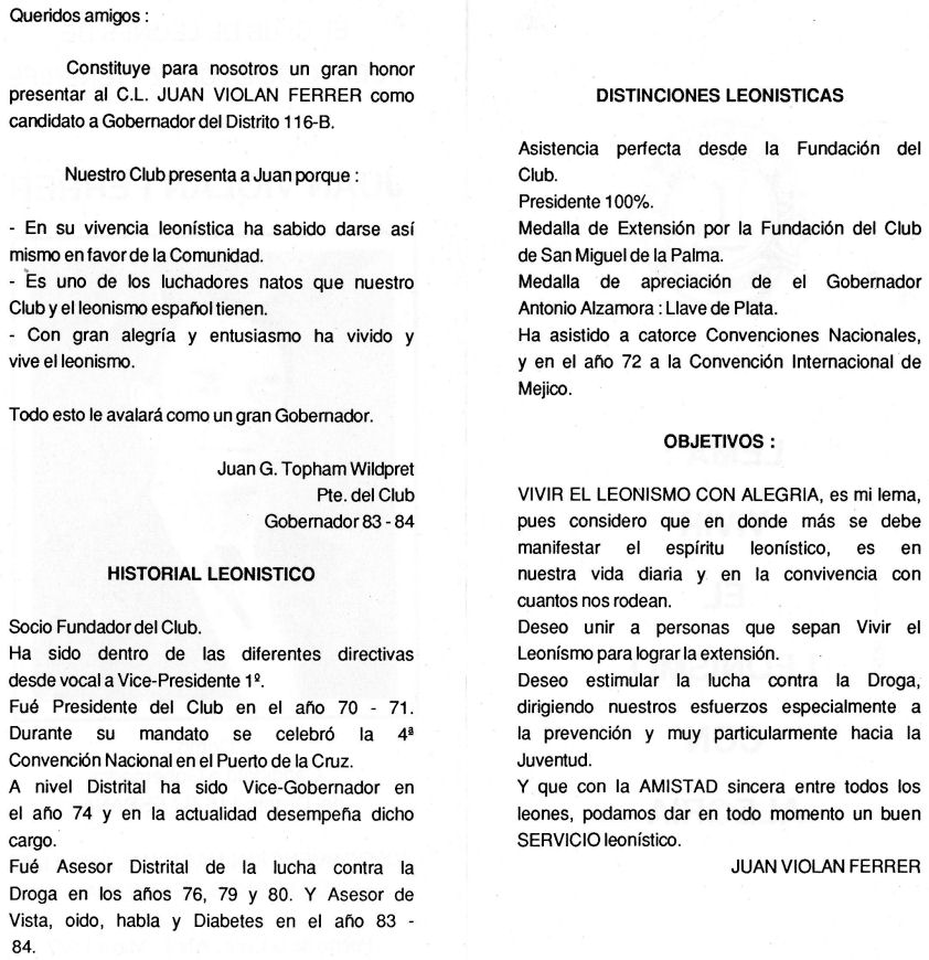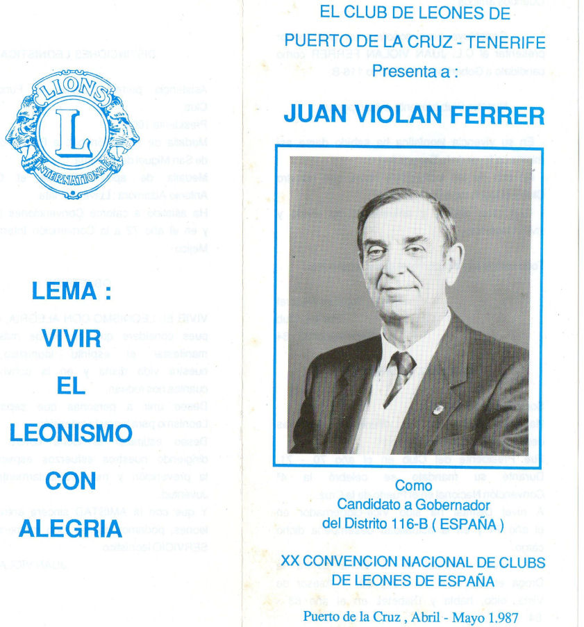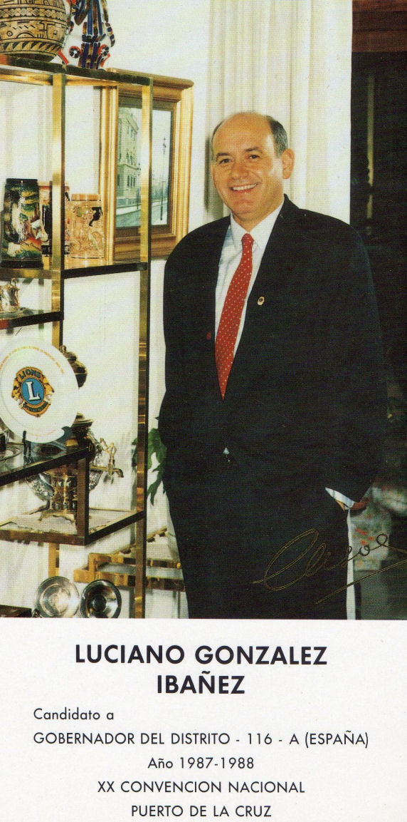 XXI Convención Nacional. Presidida por Simón Viñals Cañil, Presidente del Consejo de Gobernadores, se celebró en Alicante a continuación de las Quintas Convenciones de los Distritos 116 A y B, presididas respectivamente por los Gobernadores Luciano González López y Juan Violán Ferrer, del ¿ de Abril al 3 de Mayo de 1986. Fue elegido Presidente del Consejo de Gobernadores, el Ex Gobernador Alberto Gordillo Parga del Club de Leones Alicante 22.000. Fueron elegidos Gobernadores para 1988/89 de los Distritos 116 A y B, respectivamente y Francisco Quintas Vicente del Club de Leones Madrid Universidad, y José Solera Barco del Club de Leones Ciudad de Ceuta. Hubo un segundo Candidato a Gobernador del Distrito 116-B, eñ compañero Henri Salvan del Club de Leones Torremolinos. Hubo un segundo Candidato a Gobernador del Distrito 116-B, eñ compañero Henri Salvan del Club de Leones Torremolinos.