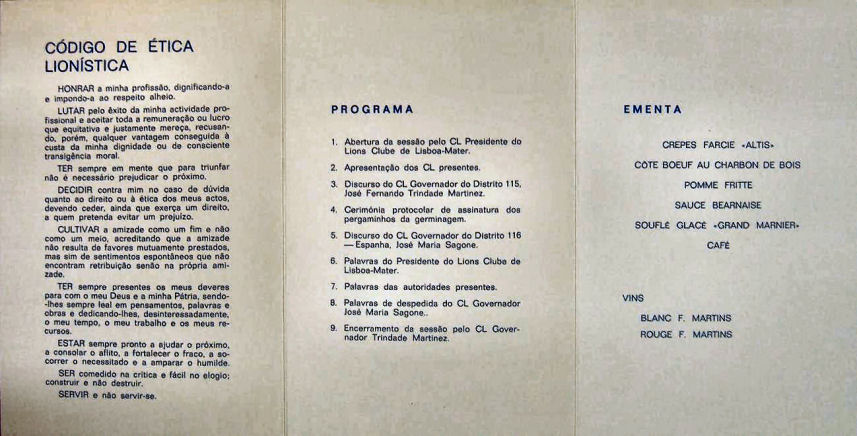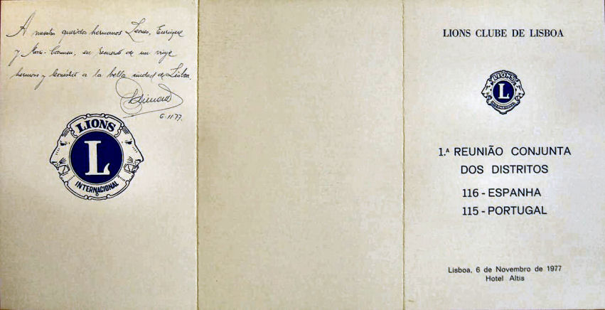 Copiado de la página 21, de no sé que revista............... 6 de noviembre de 1977 será un hito importante en la historia del Leonismo Ibérico. Los Clubs de leones de Portugal y España celebraban el Hermanamiento de sus dos Distritos, en Lisboa. La idea fue del Pasado Gobernador portugués Arnaldo Gouveia y los actuales Gobernadores José Fernando Trindade Martínez del Distrito 115 y José María Sagone del Distrito 116, la han llevado felizmente a cabo, tras una reunión conjunta de los dos Gabinetes, que celebraron la víspera su 2.ª Asamblea en salones separados. La finalidad está claramente expresada en el pergamino cuya versión en español reproducimos junto a este texto. La versión portuguesa quedó en poder del Gobernador Trindade Martínez quien obsequió a nuestro Gobernador con una valiosa edición de «Os Lusiadas» de Luis de Camoens. Del