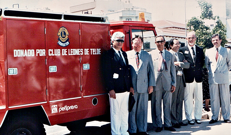LEONES DE TELDE El Club de Leones de Teide en Gran Canaria, entregó un coche de bomberos al Ayuntamiento que no poseía este vehículo, aportando la Fundación (LCIF) 17,650 $USA. Durante varios años, ha sido actividad principal del Club de Leones de Telde en Las Palmas, el recaudar fondos para proveer de un coche contra incendios al Municipio, que carencia de este medio de protección comunitario. La inversión realizada ha sido superior a los seis millones de pesetas, de los cuales, dos y medio ha sido donación de la Fundación Lions Internacional, y el resto, aportación de otros Clubs de la Provincia y aportaciones de los propios vecinos de aquella ciudad en distintas actividades organizadas por el Club.