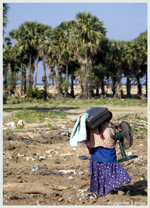 En el campamento, el humo de las hogueras continua ascendiendo mientras los pocos pescadores que quedan reparan sus redes en la esperanza de poder trabajar de nuevo. Uno de ellos nos dijo:” No tenemos nada. Hemos perdido a 200 de nuestra gente y todos seguimos intentando comprender por qué pasó esto. Es terrible, lo único que podemos hacer es vivir el día a día. Apenas se nos ha ayudado y por eso estamos queriendo sobrevivir por nuestra cuenta. Cada día es un apuro.” Dentro de sus penas, los vecinos intentan sobrevivir con lo que tienen pero no tienen nada sino lo puesto. Lavan a sus hijos con calderos de agua y les quitan los piojos del pelo para evitar inevitables infecciones a estos niveles de miseria. Son gente digna y orgullosa que no están acostumbrados a vivir así y aunque hacen lo imposible por tener sus casetas limpias resulta imposible con estos calores y falta de higiene. Quieren contarnos una y otra vez cosas sobre sus hijos y seres queridos a quienes nunca más volverán a ver. Una mujer perdió a su hija y a su yerno. Con los ojos envueltos en lágrimas abraza una foto y nos dice: “Lloro por ellos día y noche. Todos lloramos porque en todas las casas alguien ha perdido algún ser querido. Cuando veo su foto sigo sin creer que no volveré a verlos.” Relatos como este abundan por todos los sitios. Relatos increíbles de supervivencia como el del niño de 10 años que conocimos en un campamento de Kalmuni, distrito de Ampara: Janathanan estaba en la escuela dominical cuando la ola se llevó a 38 de sus compañeros. Sobrevivió subiéndose a un árbol. Aquella tarde encontró a sus padres muertos en una camilla del hospital. Ahora se encuentra solo y juega en el campamento en pijama-camiseta y pantalón corto raídos. Un amigo de la familia que lo cuida dice que no menciona a sus padres pero les habla cuando esta dormido.