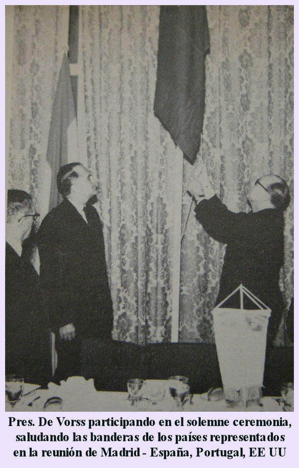 128º El Pres. Inter. Claude M- De Vorss estuvo en Madrid para discutir la función del Leonismo en la vida de España, con altos miembros del Gobierno y para oficializar la presentación de la ceremonia de la entrega de la Carta Constitutiva. Estuvo acompañado por el tercer Vice-Pres. Inter. Jorge Bird. Pres. De Vorss y Vice-Pres. Bird, se reunieron con el “Premier” Francisco Franco y miembros de su gabinete. Estuvieron acompañados por el embajador de EE UU en España Robert Woodward. Durante las discusiones, el Pres. Inter. De Vorss presentó al Generalísimo la medalla Leonístico Jefe de Estado. España es el segundo país grande en hacerse país miembro de Lions Internacional en los últimos años. Primera en 1963, fue Turquía con el establecimiento del Club de Estambul. Aunque España tiene un territorio más pequeño (Un poco más grande que california) que Turquía, tiene una población mayor. El presidente del new Club es Juan Abello Pascual, un diputado. Su señas es Paseo de Moret 9, Madrid. THE LIONS, edición inglesa de marzo 1965 TWO COUNTRIES OF LIONISM