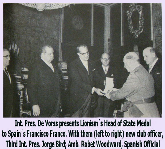 Int. Pres. Claude M. De Vorss was in Madrid to discuss the role of Lionism in Spanish life with top level members of the government and to officiate at club charter presentation ceremonies. He was accompanied by Third Int. Vice-Pres. Jorge Bird. Pres. De Vorss and Vice-Pres. Bird met with Premier Francisco Franco and members of his cabinet. They were joined by U.S. Ambassador to Spain Robert Woodward. During the discussions, Int. Pres. De Vorss pre¬sented the Generalissimo with Lionism's Head of State Medal. Spain