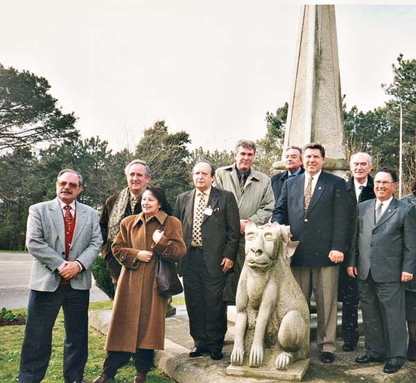 Compañeros de Portugal y España ante el monumento del Leonismo esculpido por el PDG Manuel Castro Alsono del Club de Leones Vigo.