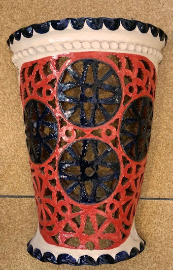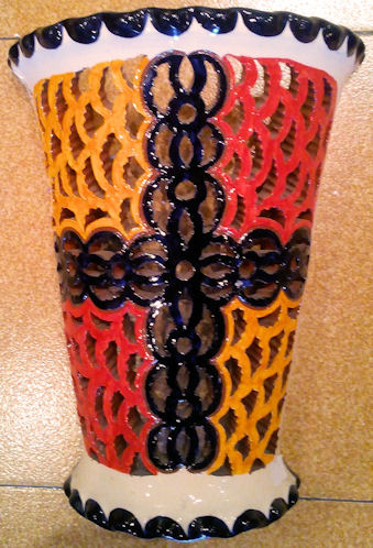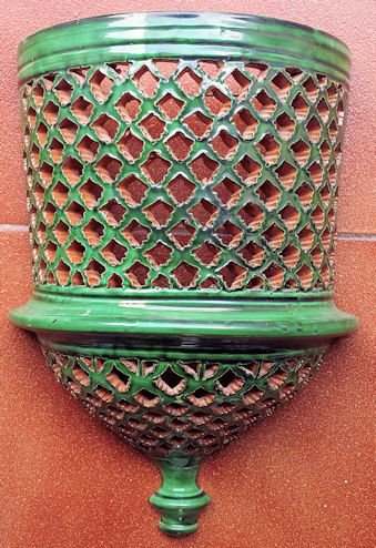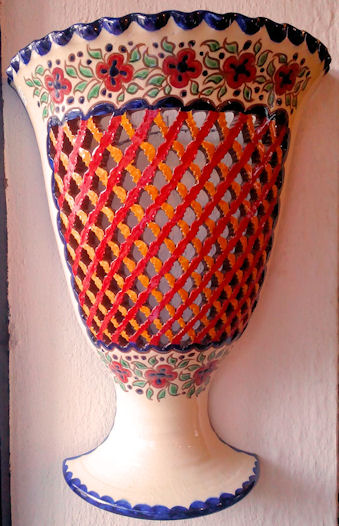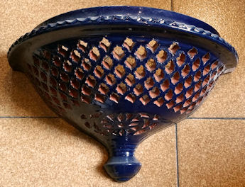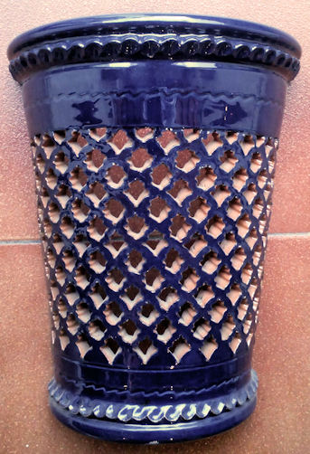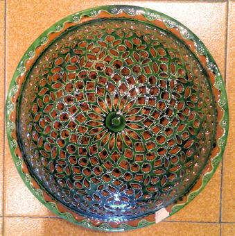 WHOLESALE - light covers Recognized as the best craftsman from Spain, in 2006. Tito is one of the most prestigious ceramic artisans in Spain, he has even been recognized as the best craftsman in Spain, for 2006. They come from a Village called Úbeda en the province of Jaen, in Andalusia. He basically hand makes these reproductions of traditional Andalusia ceramic, in other words the popular style that was used in the countryside during many centuries. The normal style had only one colour, normally, the green, and sometimes mustard, blue or cream. In 2006 he creates what he has called the "Repintado" style, which means repainted. What he does is make the pieces in the cream colour, and repaints them with these vivid colours and then they cooked the pieces again. So you can see these marvelous colored pieces, which are an exceptional pieces of art work. As you can see there are two basic styles. The classical and the "Repintado". As I told you before his classical style comes in four different basic colors, green, blue, beige and mustard. Plus all the pieces can come "Calado" or normal. The "Calado" is the cut out work you can see in the pictures. Want they do is let the ceramic dry a little for a few days and then cut it out, it's a tremendous amount of work. In the classical style you might think they have two colors, well NO. Want they do is soak the pieces in the color enamel and after carve away the paint until the natural color of the ceramic comes out, really extraordinary art work. That's why every single piece is totally different you will never have two pieces a like. The bottom line is that everything is possible in any size, any color or any style. Some craftsmen have moles, so all the plates come out in the exactly same size, but these Artisan hand throw every single piece. So the chose is infinite. As these plates are all hand thrown, they can’t be flat, they are slightly concave. The larger the plate is, more concave it has to be, if not it can’t be made.