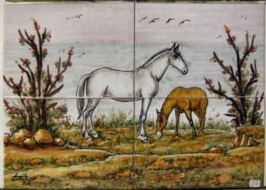 Aquí tienen azulejos de diferentes artesanos de Puente del Arzobispo, son todos buenos como podrán ver. Y estos son de un precio más razonable. Es muy fácil saber el precio, simplemente múltiple cada azulejo por 27 euros, por ejemplo si tiene 6 azulejos, su precio sería 162.00 Euros. Actualmente tenemos todos estos azulejos en la tienda, como pueden ver el estilo cambia dependiendo del artista. Uno de los artesanos Sr. Fraile ya no trabaja más, es el que ha hecho la pintura de los caballos, solamente me quedan 5 pinturas suyas. Aquí también cualquier dibujo y en cualquier tamaño se puede hacer por encargos. Por favor también entren en esta página web: www.mijasceramic.com o escríbanos a: NUESTRO E-MAIL |