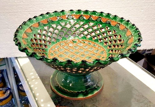 Tito es uno de los nombres con más prestigio en España, incluso ha sido reconocido como el mejor artesano de España en el 2006. El viene de un pueblo llamado Úbeda de la provincia de Jaén, en Andalucía Básicamente él hace a mano estas reproducciones de cerámica tradicional andaluza, dicho de otra forma cerámica popular, que fue usado en el campo durante muchos siglos. El estilo normal tenía un solo color, normalmente el verde, y a veces ocre, azul o crema. En 2006, el creó un estilo llamado “repintado”. Lo que hace es coger las piezas de color crema y los repinta con estos colores tan vivos, volviendo a cocerlos otra vez más. De esta forma pueden ver estos maravillosos colores, que son un trabajo excepcional de artesanía Española. Como pueden ver hay dos estilos diferentes, el clásico y el “Repintado”. Como dije antes, el estilo clásico viene en cuatro colores básico, verde, azul, crema y ocre. Además todos las piezas pueden venir “calados” o normal. El calado, es el corte y perforación que hacen y pueden ver en las fotos. Lo que hacen es esperar que se seque un poco la cerámica durante algunos días y cortar estos agujeros, es un trabajo tremendo. En el estilo clásico, ustedes pueden pensar que hay dos colores, pues no, lo que hacen es meter las piezas en el esmalte y luego quitan el esmalte hasta que el color de la cerámica vuelva a salir, realmente es un trabajo extraordinario. Por esto cada pieza es totalmente diferente, nunca tendrá dos piezas iguales. Por lo tanto, se puede decir que cualquier pieza se puede hacer en cualquier tamaño o estilo. Algunos artesano tienen moldes para hacer los platos, por lo tanto todos tiene el mismo tamaño, pero este artista tira a mano todas las piezas. Por ello, no pueden ser totalmente planos, y son ligeramente cóncavos. Si más grande es el plato, más cóncavo tiene que ser. Por favor también entren en esta página web: www.mijasart.com o escríbanos a: NUESTRO E-MAIL |